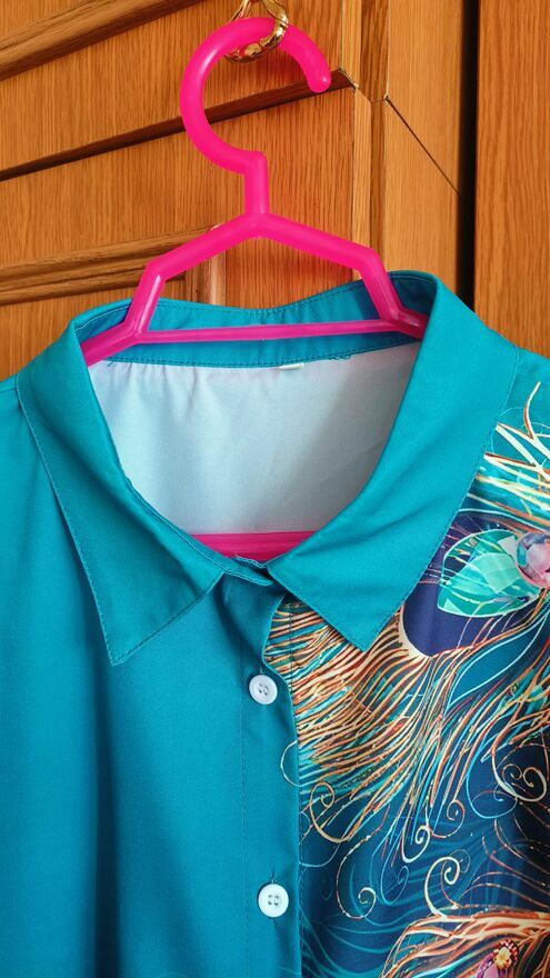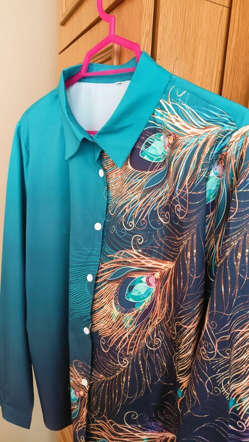 Multikolorowa nowa bluzka koszulowa. Wzory piór pawia. Długi rękaw, kołnierz, guziki. Rozmiar XXL, 95% poliester, 5% spandex. Można odebrać osobiście, mogę wysłać Pocztą Polską.Beata