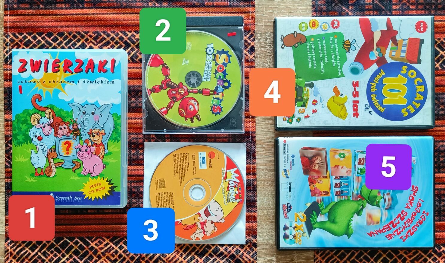 Nr 1. Zwierzaki zabawy z obrazem i dźwiękiem, CD-ROM, interaktywna, multimedialna płyta, zagadki, ćwiczenia,piosenki do wspólnego śpiewania, kolorowanki. Dla dzieci, rodziców, logopedów. Stopniowana trudność. Dla przedszkolaków, szkoła podstawowa i dzieci z zaburzeniami mowy. Poprawia ważność słuchania, różnicowanie i identyfikacja bodźców wzrokowych i słuchowych, koncentracja uwagi na sygnałach dźwiękowych, porównywania i naśladowania. Płyta ćwiczy pamięć i wrażliwość słuchową i wzrokową, wyobraźnię, koncentrację wzrokowo/ruchowo/słuchowej. Rozwija logiczne myślenie, orientację przestrzenną, słownictwo dziecka. Win 95/ Vista, Nr 2. Sokrates 102 ciekawe zadania, wiek dziecka ok. 6-9 lat. Win 95/98/2000/Vista CD-ROM. Nr 3. Król Maciuś zabawy z przyjaciółmi, przedszkole. Na podstawie bajki Król Maciuś Pierwszy. Zabawy edukacyjne, interaktywne, WIN 95/98/ME/2000/XP/Vista. NR 4. Sokrates 101 prostych ćwiczeń, wiek dziecka 3-5 lat, czytanie, pisanie, liczenie, rozpoznawanie dźwięków, kształtów i kolorów. Nazwy osób, przedmiotów i zwierząt, puzzle, labirynty. Ponad 100 edukacyjnych gier i zabaw. Zgadywanki, układanki. Która jest godzina? Proste eksperymenty fizyczne. CD-ROM, WIN 95 /98 /2000/VISTA Nr 5. Igraszki logopedyczne Smoka Szczepana, Potężne narzędzie terapeutyczne, które pozwoli Ci samodzielnie wychwycić, nazwać bądź całkowicie wykluczyć wadę wymowy Twojego dziecka, za pomocą testu na płycie. 25 zabawnych ćwiczeń Smoka Szczepana w połączeniu z ćwiczeniami całych słów jako lekarstwo na dziecięce wady wymowy. Jako dodatek jest film o etapach rozwoju. Film uczy dziecko jak prawidłowo układać język, wargi i policzki w bardzo przyjazny sposób, wesoły odpowiedni dla dzieci. To trening narządów mowy wykonywany przez dzieci z rodzicami. Żadnej nudy, Smok Szczepan o to zadba. Wiek dziecka od niemowlaka do ucznia. W zestawie są dwie płyty, jedna dla rodziców, druga dla dzieci. Czas nauki 118 min. DVD, Sprawdzone na Vista. UWAGA! Wszystkie płyty jakie mam na sprzedaż są używane, w dobrym lub super stanie, sprawdziłam je w październiku 2025, nadal działają na Vista, kupujesz na własne ryzyko, nie sprawdzone na innych systemach, brak zwrotów! Mogę wysłać lub można odebrać osobiście. Nie wysyłam OLX, mimo że musiałam tak zaznaczyć WYSYŁAM POCZTA POLSKA.Sprawdź zainteresowanie tym ogłoszeniem