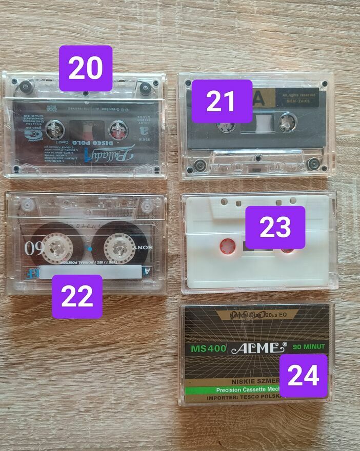 Nr 20. Disko Polo-Ballady Nr 21. Piosenki-Memory Nr 22. Piosenki-Sony Nr 23. Piosenki- biała kaseta Nr 24. Disko Polo -Green Star Music. Kasety działają, sprawdziłam je w radiomagnetofonie X.2025r. Uwaga! Brak gwarancji, kupno na własne ryzyko, brak zwrotów. Mogę wysłać tylko przez pocztę polską, można odebrać osobiście.Sprawdź zainteresowanie tym ogłoszeniem