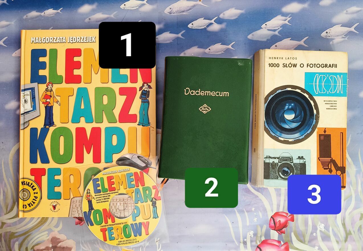 Książki używane. Nr.1 Elementarz komputerowy, M. Jędrzejek, to zestaw z płytą do nauki obsługi komputera od podstaw, ćwiczenia, nauka, zabawa. 208 str, twarda oprawa. Nr.2 Vademecum Polfa, wydawnictwo medyczne, alfabetyczny wykaz leków, skład, zastosowanie itp. 1251 str. Nr.3 1000 słów o fotografii, H. Latoś, twarda oprawa. Można odebrać osobiście, mogę wysłać przez Pocztę Polską.Sprawdź zainteresowanie tym ogłoszeniem