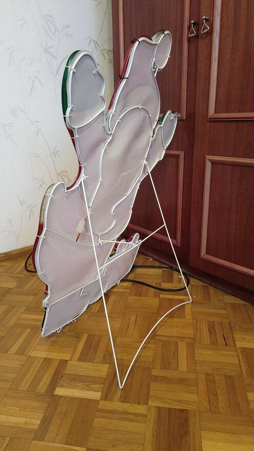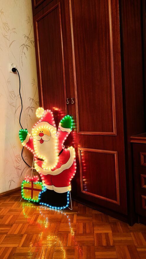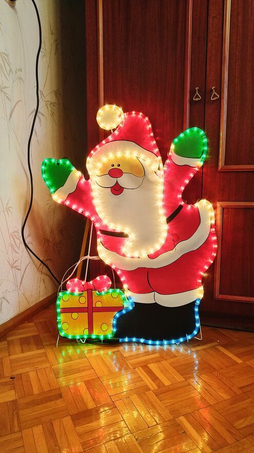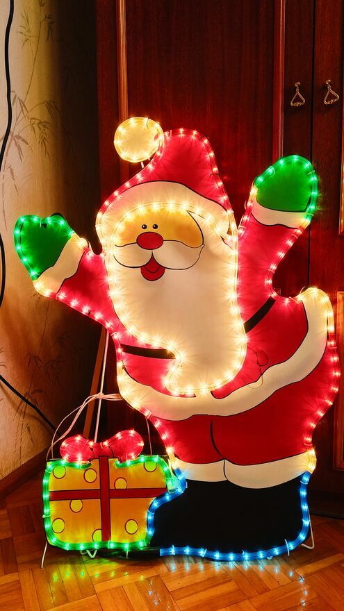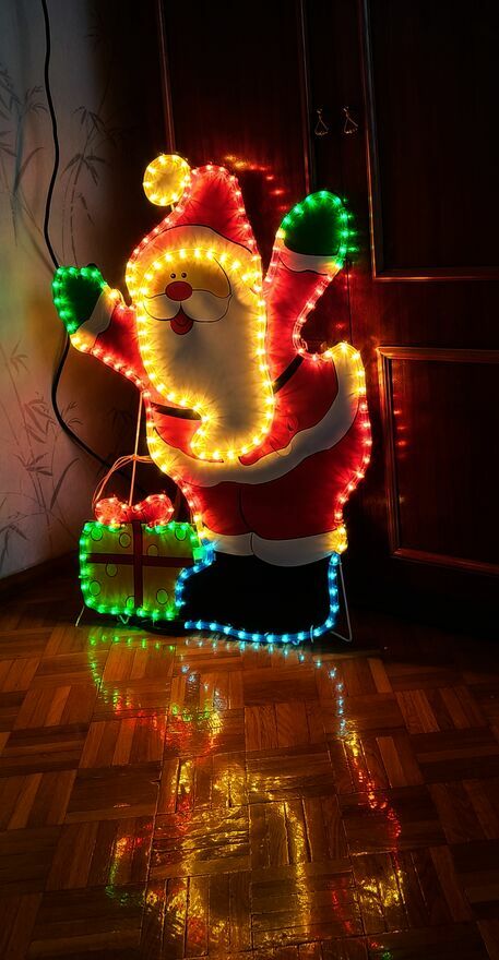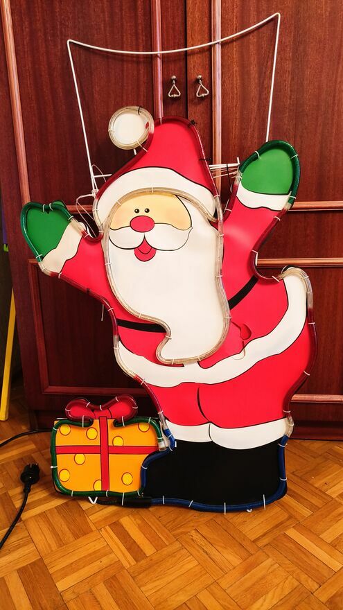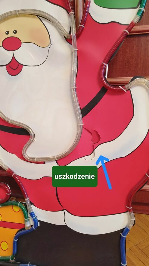 Dekoracja świąteczna w kształcie stojącego-wiszącego Świętego Mikołaja. Figurka jest kolorowa i jasno podświetlona, co nadaje jej magiczny i świąteczny charakter. Doskonała ozdoba na okres Bożego Narodzenia, która wprowadzi ciepłą atmosferę do każdego domu. Uwaga, lekko uszkodzony, zobacz na zdjęciu. Można odebrać osobiście, mogę wysłać przez Pocztę Polską. Kupujesz na własne ryzyko uszkodzenia w transporcie, zapakowane będzie w karto, folię i boki styropian, brak zwrotu. Cena wysłania 30 złBeata
