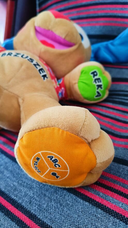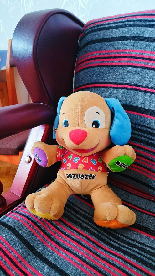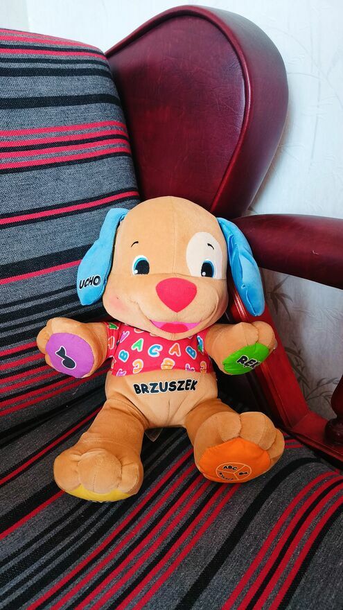 Interaktywna zabawka pieszej, idealna do nauki poprzez zabawę. Zawiera różnorodne funkcje edukacyjne, które pomagają rozwijać umiejętności dziecka. Doskonała propozycja dla małych odkrywców i ciekawskich umysłów. Po naciśnięciu ,,ucho", ,,nutą", ,,ręka", brzuszek", ,,noga", ,,ABC-nuta-wł/wył". Piesek nazywa części ciała, mówi różne zdania, śpiewa, wydaje dźwięki. Wiek od 6 miesięcy. Z tyłu pod ubraniem jest Wł/Wył całej zabawki. Trzeba dokupić 3 szt ,,bateria AA LR6 1,5 V duże paluszki" Stan jak na zdjęciu, sprawdzona zabawka e listopadzie 2025, działa. Kupujesz na własne ryzyko, brak zwrotów. Można odebrać osobiście , mogę wysłać przez Pocztę Polską.Beata